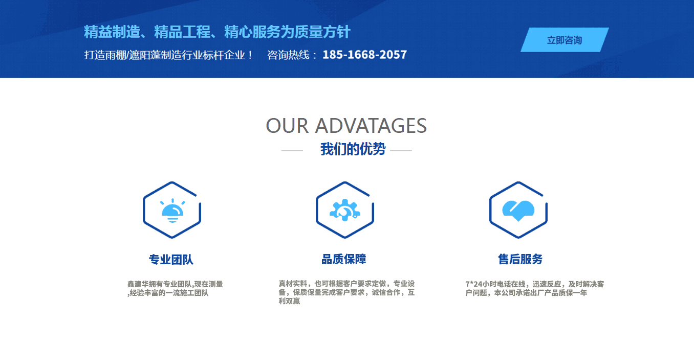 鑫建華雨棚有限公司成立于2012年,公司全體勵(lì)精圖治,飛速發(fā)展,已從初創(chuàng)業(yè)公司發(fā)展成為多元化公司,目前公司員工約1000余人,其中擁有中、高級(jí)專(zhuān)業(yè)技術(shù)人員100余人,形成以戶(hù)外制造產(chǎn)業(yè)為主,其他第三產(chǎn)業(yè)為輔的多元式經(jīng)營(yíng)模式,旗下設(shè)有鋼結(jié)構(gòu)公司,環(huán)保設(shè)備公司.其鋼結(jié)構(gòu)公司主要以研發(fā),設(shè)計(jì)、生產(chǎn)、營(yíng)銷(xiāo)、安裝、服務(wù)為一體的鋼結(jié)構(gòu)生產(chǎn)制造型企業(yè),環(huán)保設(shè)備公司主要以“綠色環(huán)保節(jié)能“為核心戰(zhàn)略品牌.公司相關(guān)資質(zhì)齊備,主營(yíng)業(yè)務(wù):定制各種推拉蓬、活動(dòng)雨棚、倉(cāng)庫(kù)雨棚、智能電動(dòng)蓬、伸縮電動(dòng)噴漆房、懸空電動(dòng)雨棚等手動(dòng),遙控電動(dòng)一體,系列產(chǎn)品,公司總部位于中國(guó).江蘇,目前,公司年經(jīng)營(yíng)規(guī)模達(dá)8千萬(wàn)以上,經(jīng)營(yíng)區(qū)減已輻射全國(guó)大部份省會(huì)城市,在雨棚領(lǐng)域展露崢嶸,“鑫建華品牌“已成為國(guó)內(nèi)雨棚,在全國(guó)市場(chǎng)的占有率及品牌均名列前茅. 公司在蘇州、天津、重慶、武漢、濟(jì)南、鄭州、江門(mén)、衡陽(yáng)均設(shè)有工廠(chǎng),覆蓋全國(guó)主要城市、八倉(cāng)生產(chǎn)制作安裝售后、國(guó)內(nèi)訂單全國(guó)范圍可上門(mén)安裝服務(wù)、國(guó)外訂單可派工程師出國(guó)指導(dǎo)安裝....